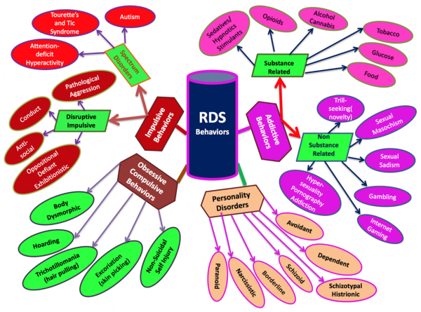 RDS can show up in many different ways, ranging from impulsive behaviors (like ADHD, aggression, or conduct issues) and obsessive-compulsive behaviors (such as hoarding, skin-picking, or self-injury), to addictive behaviors (including drugs, alcohol, food, gambling, or internet gaming) and even certain personality disorders.